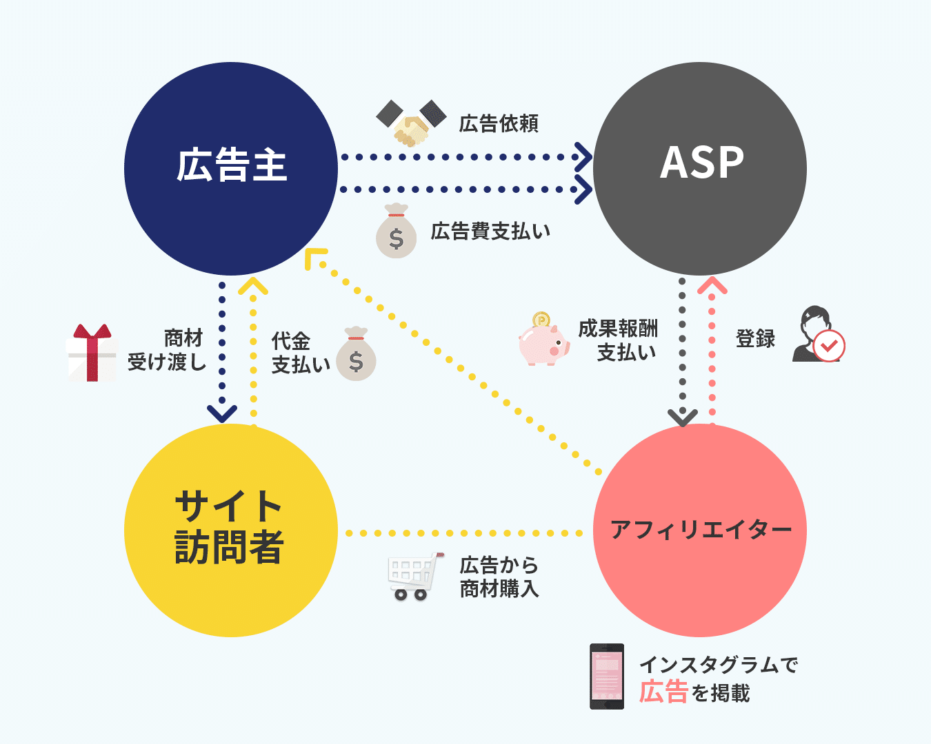 ASPからアフィリエイターに報酬が支払われるという仕組みです。
